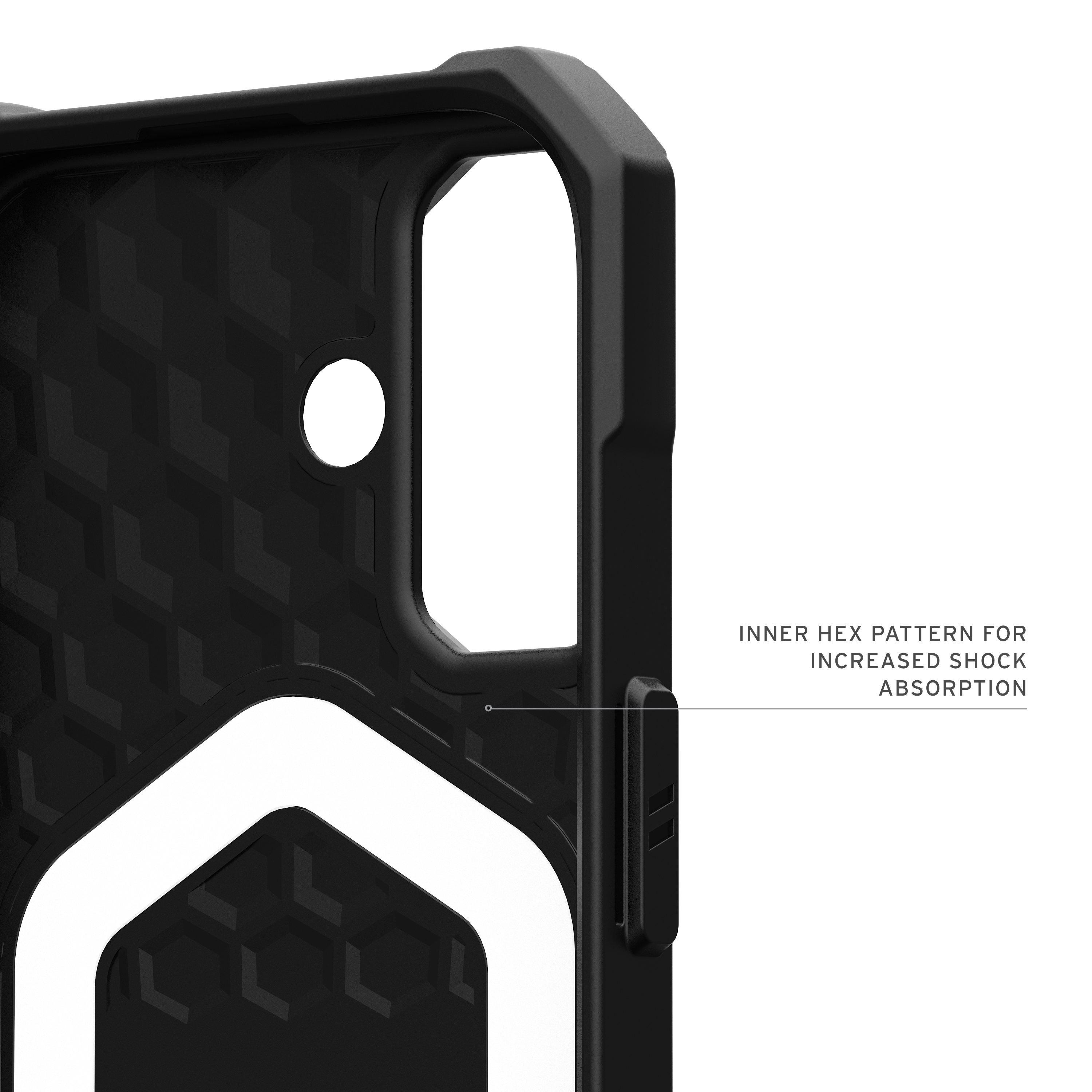 Erlebe erstklassigen Schutz ohne zusätzliches Volumen mit der Essential Armor MagSafe‑Hülle. Gefertigt aus leichten Materialien bietet diese Hülle zuverlässigen Fallschutz dank ihrer robusten, ko‑geformten Konstruktion und dem stoßabsorbierenden inneren Hex‑Muster. Erhöhte Ränder rund um Kamera und Display schützen Objektive und Bildschirm vor Kratzern und Abnutzung im Alltag.