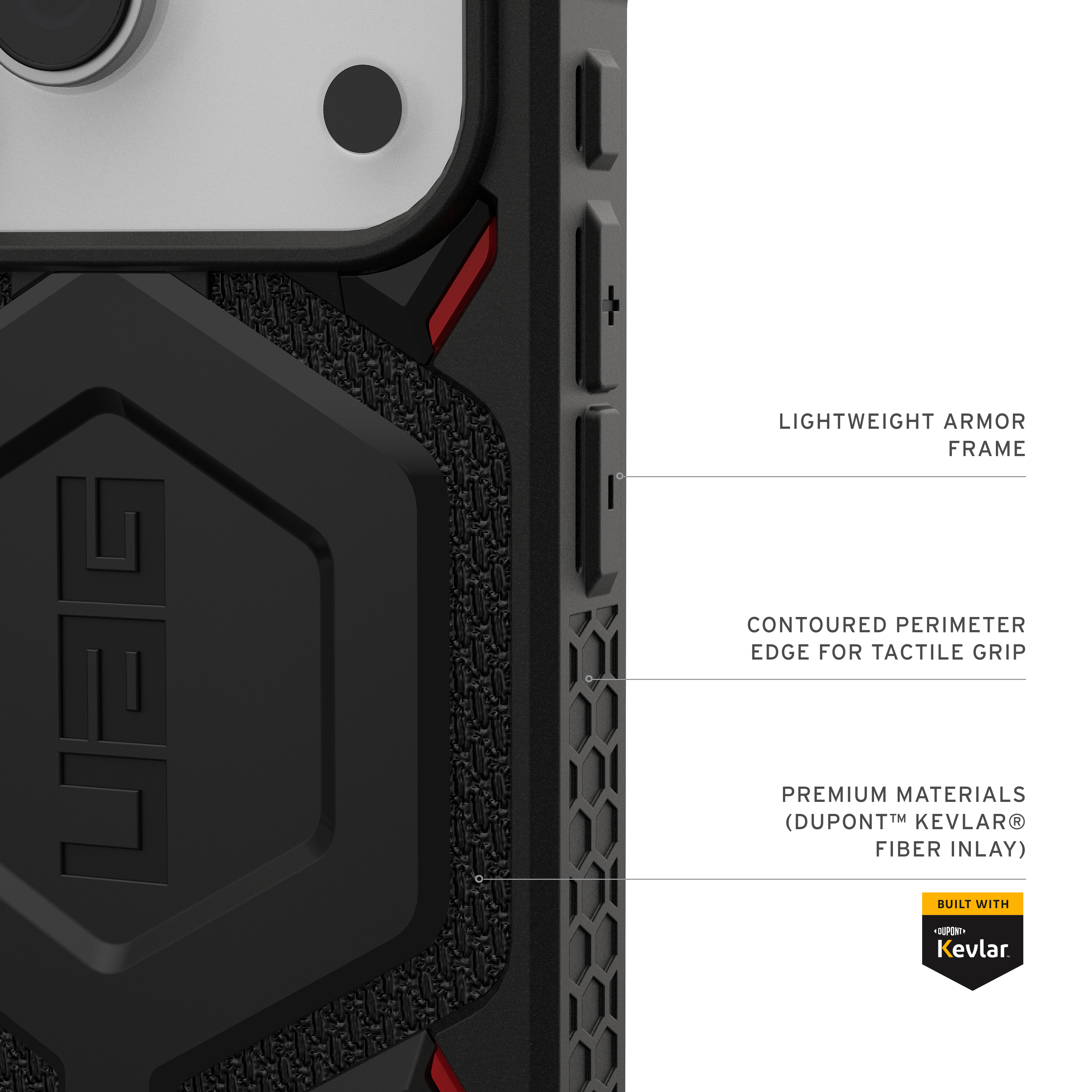 Das Monarch Pro Kevlar® Case ist die erste Wahl für alle, die maximale Robustheit mit moderner Funktionalität verbinden möchten. Gefertigt aus DuPont™ Kevlar® bietet es eine extrem widerstandsfähige, geländetaugliche Konstruktion in einem dennoch leichten Rahmen. Ein leistungsstarkes, integriertes Magnetmodul sorgt für nahtloses MagSafe®‑Laden und mühelose Kompatibilität mit magnetischem Zubehör.
