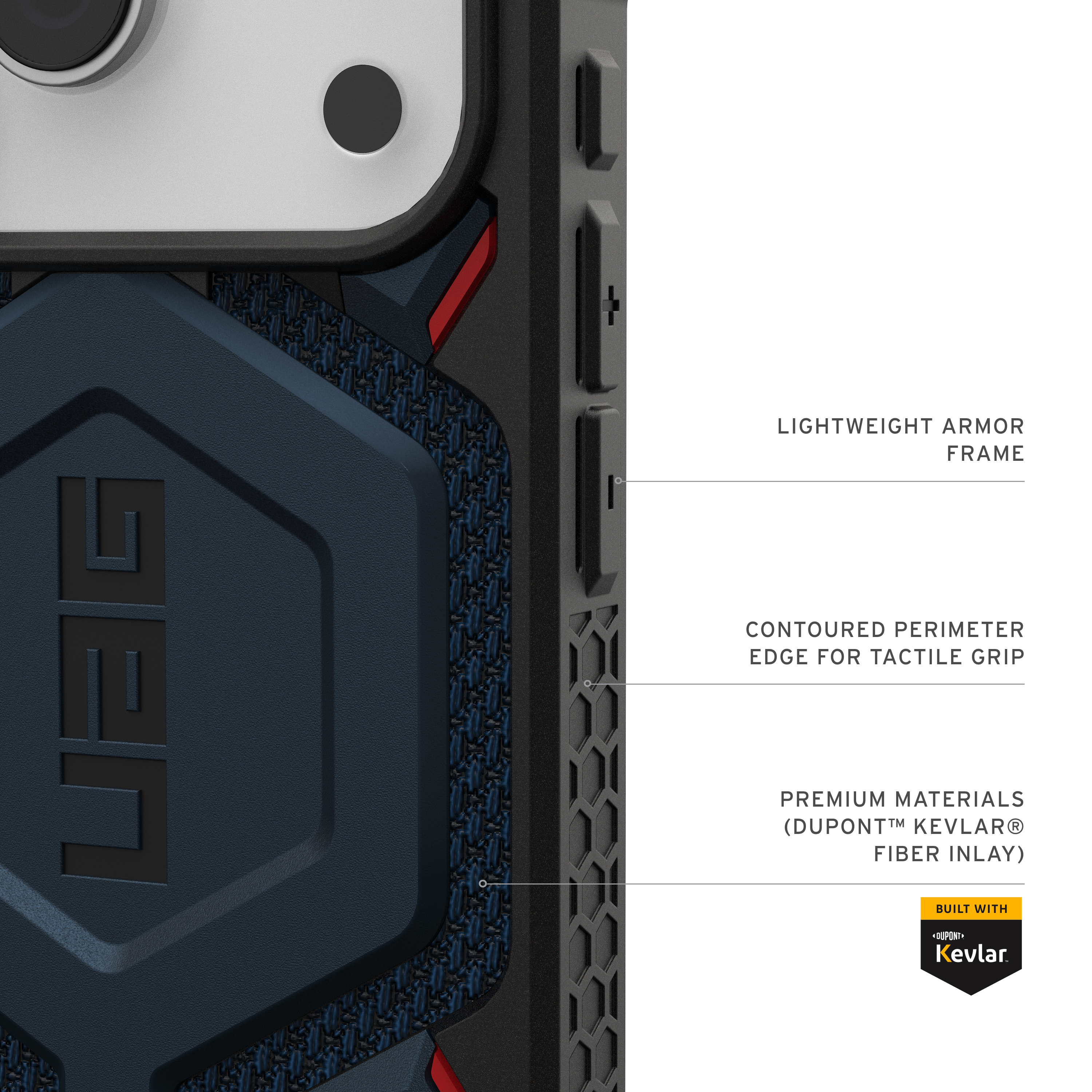 Dank hochwertiger Materialien liefert die Monarch Pro Kevlar® Hülle unübertroffenen Schutz durch ihre innovative, mehrschichtige Konstruktion: