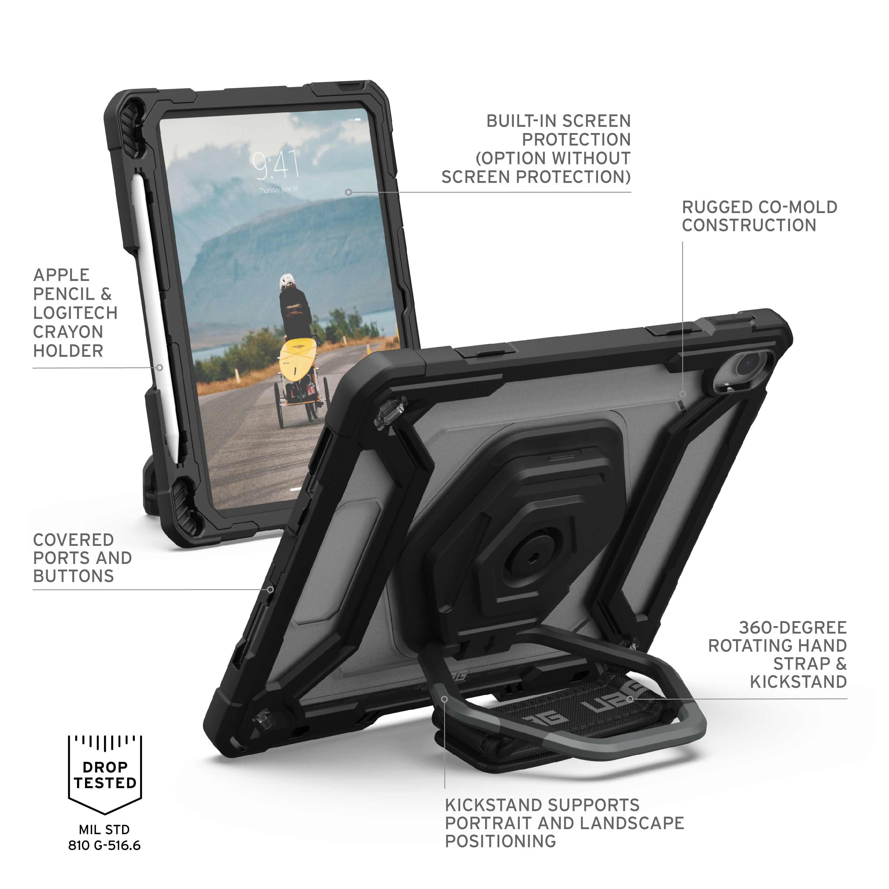 Die Plasma Series iPad-Hülle wurde für alle entwickelt, die das Maximum aus ihrem Gerät herausholen möchten. Der bequeme, integrierte 360-Grad-Rotations-Handriemen sorgt für optimalen Halt und erleichtert das Arbeiten unterwegs. Ein Halter für den Apple Pencil (1. Generation) und den Logitech Crayon stellt sicher, dass Ihr Stift stets sicher verstaut und griffbereit ist.
