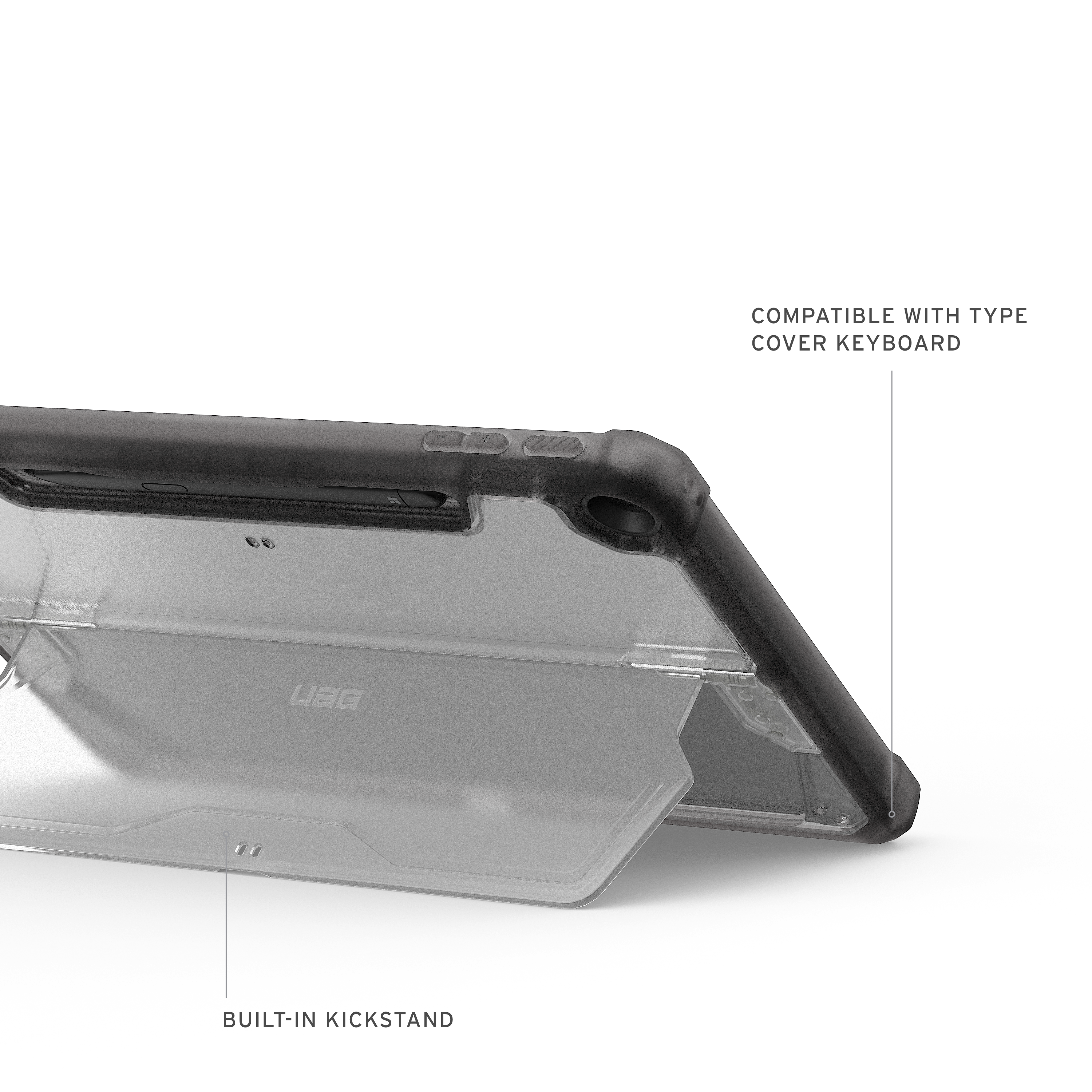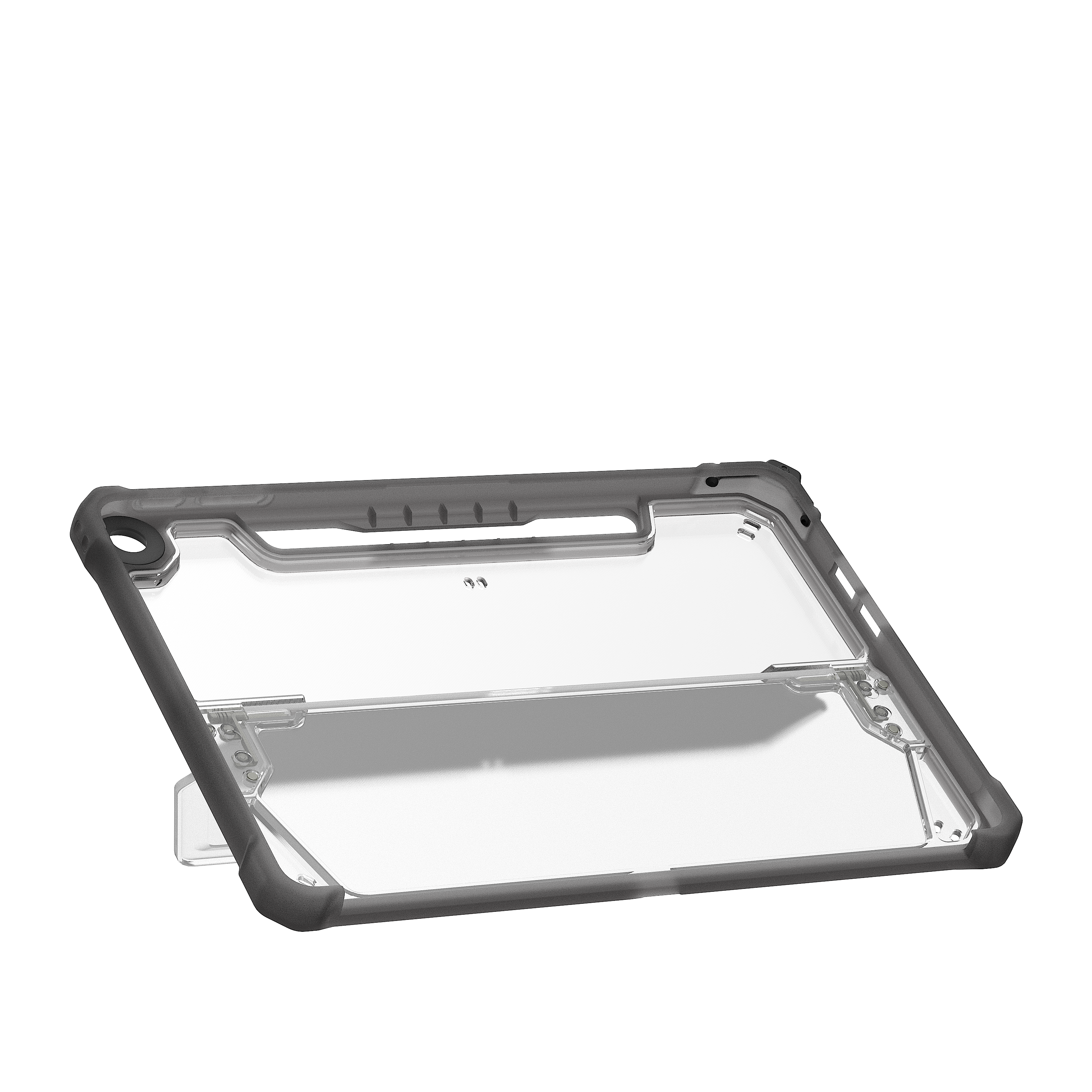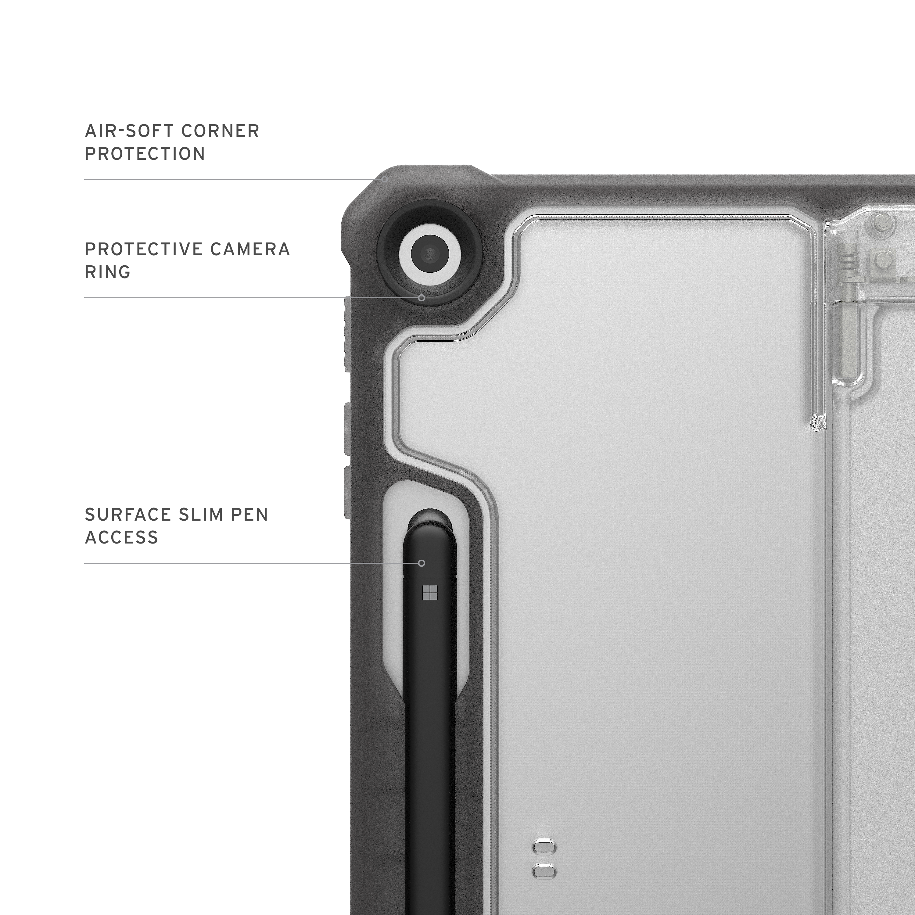 Ein integrierter Kickstand ermöglicht flexible Betrachtungswinkel im Querformat sowie eine komfortable Schreibposition. Der eingebaute Surface Slim Pen‑Halter sorgt dafür, dass Ihr Eingabestift stets sicher verstaut und leicht erreichbar bleibt. Die transparente Rückseite ermöglicht eine unkomplizierte Inventarisierung.