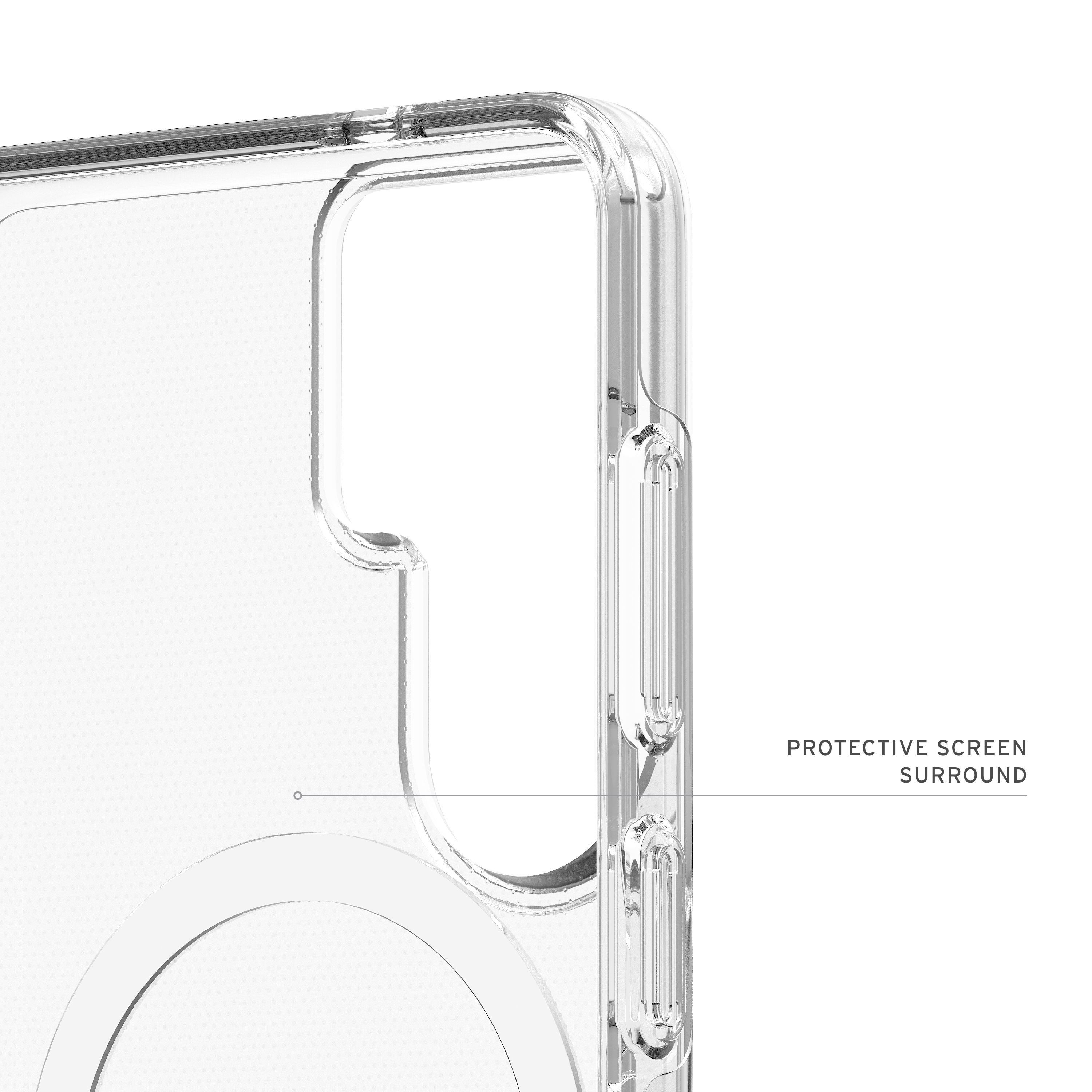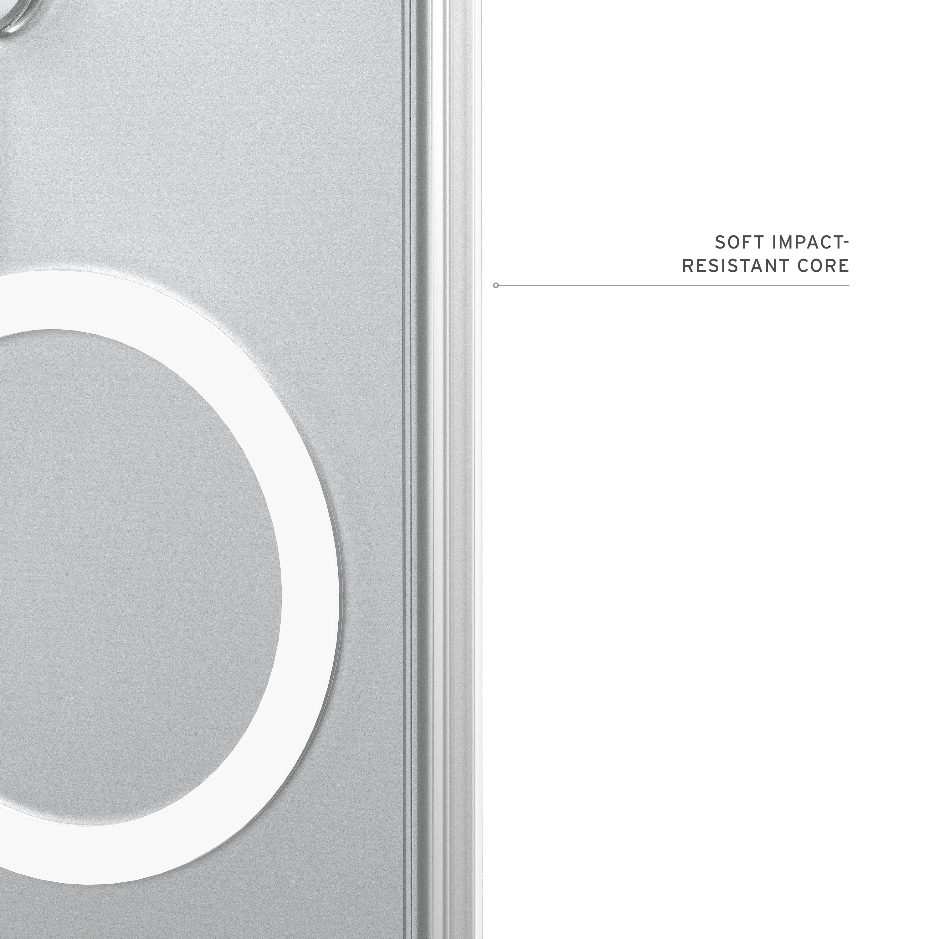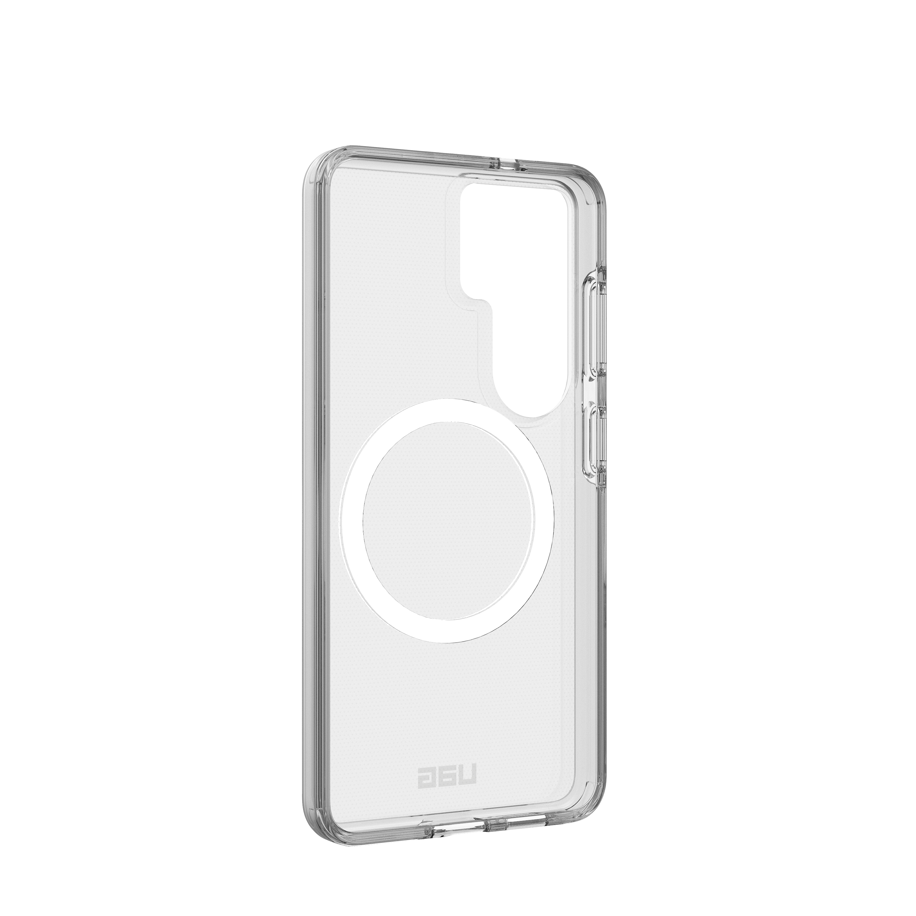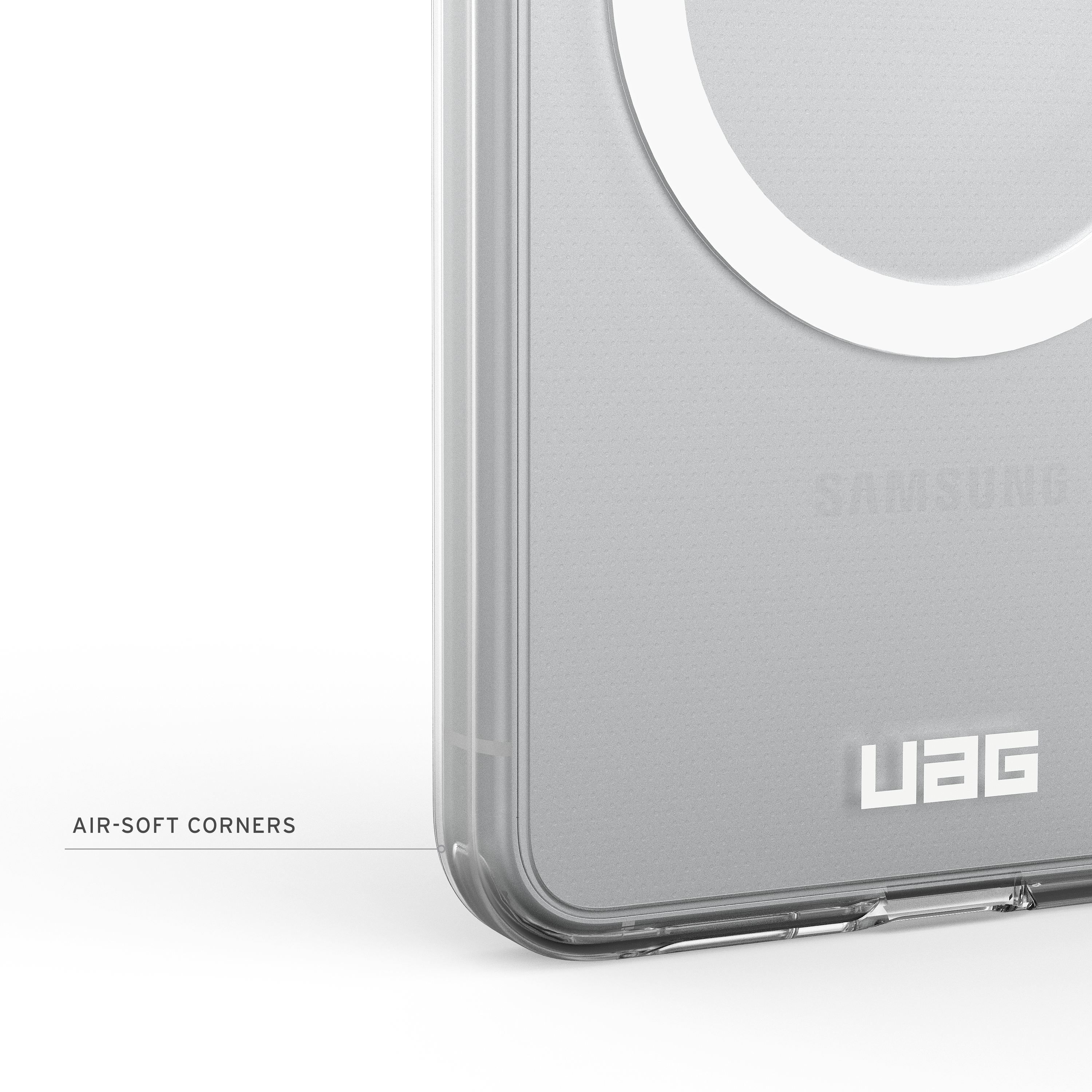 True Clear Co-Mold Design: Transparente Armor-Schale kombiniert mit stoßresistentem Softcore für langanhaltende Klarheit und zuverlässigen Schutz, abgerundet durch ein dezentes UAG-Logo und einen weißen Magnetring.