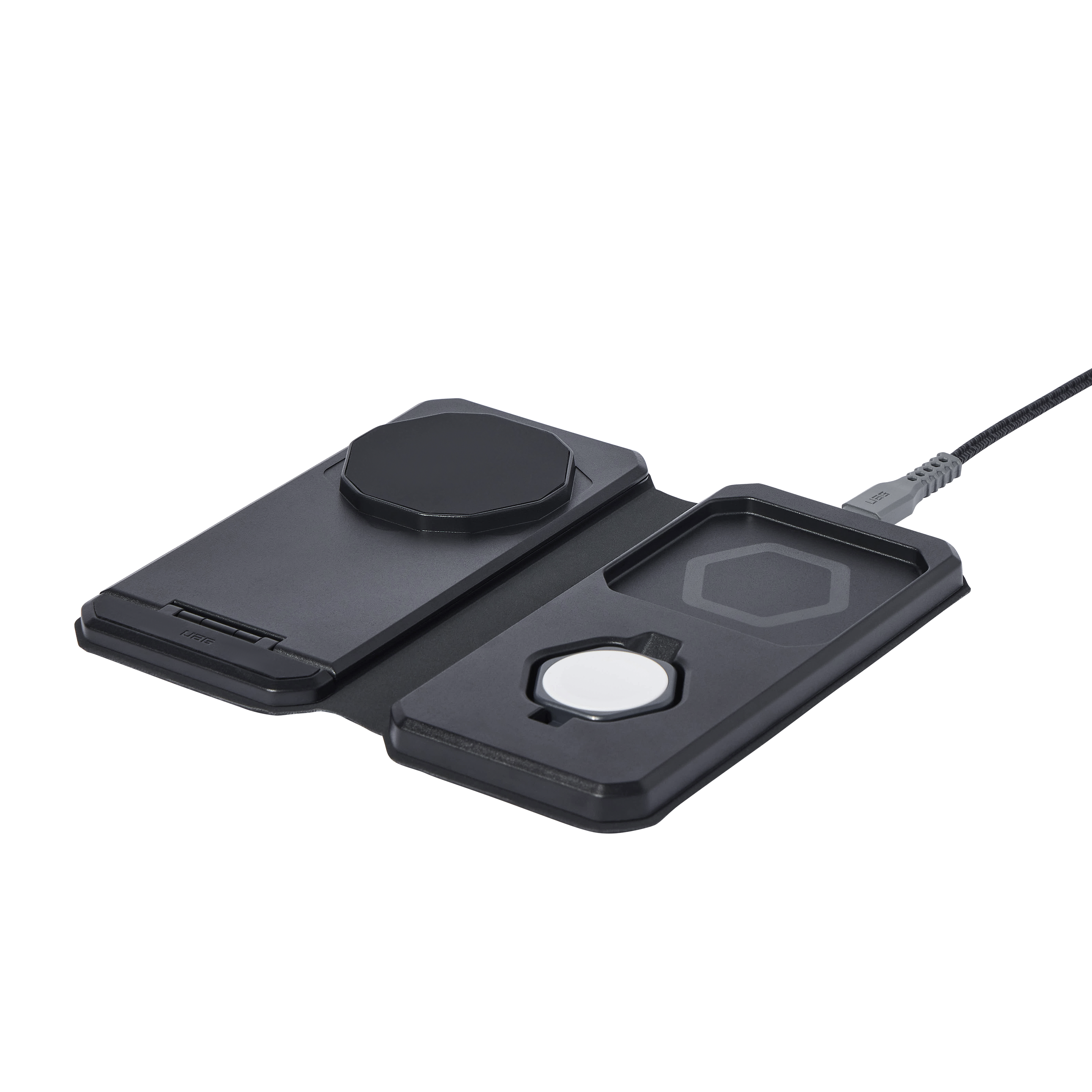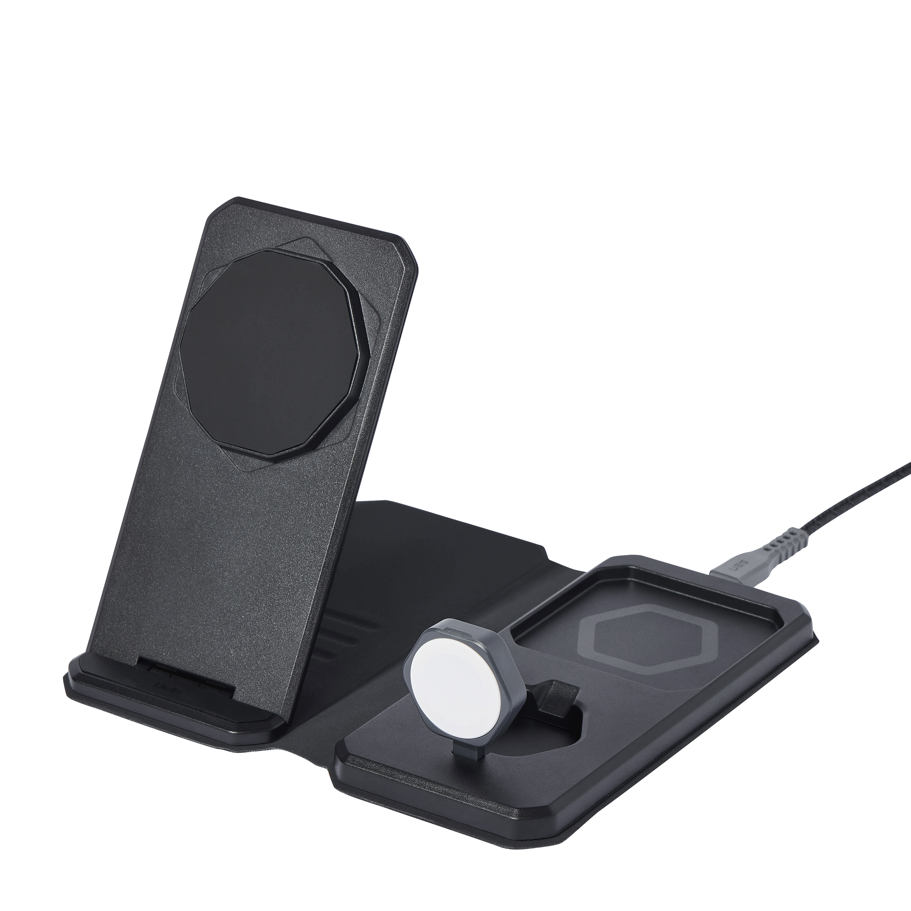 Das UAG SRGE 3-in-1 Desktop-Ladegerät ist eine vielseitige Lösung, die Ihr Ladeerlebnis optimiert. Entwickelt für das gleichzeitige Laden mehrerer Geräte bietet die Ladestation spezielle Bereiche für Ihr iPhone, Ihre AirPods und Ihre Apple Watch. Das schlanke, klappbare Design eignet sich perfekt für den Schreibtisch, Nachttisch oder für unterwegs.